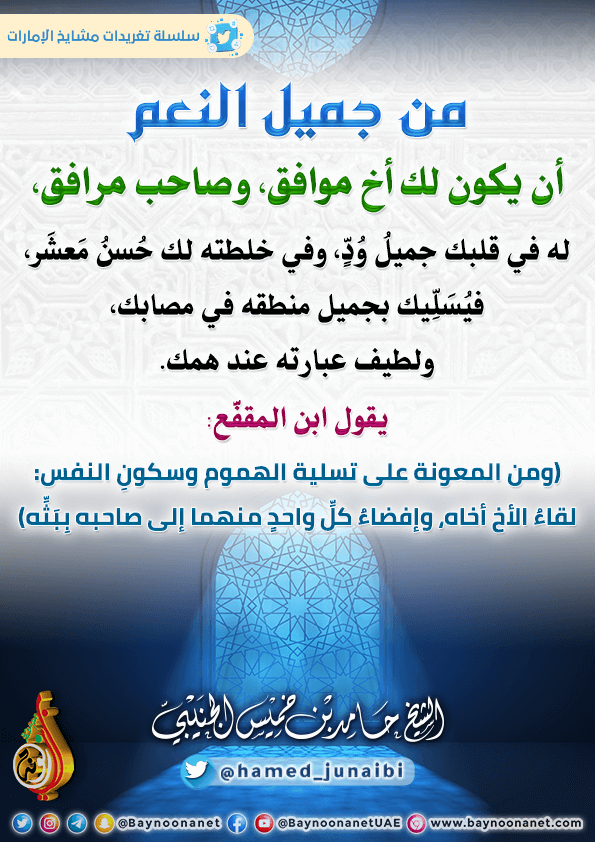 من جميل النعم أن يكون لك أخ موافق ... تاريخ الإضافة: الجمعة, 13/08/2021 - 15:56 التصنيفات الشيخ: حامد بن خميس الجنيبي