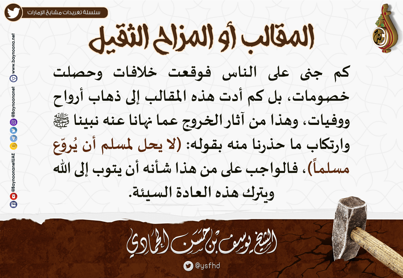 المقالب أو المزاح الثقيل تاريخ الإضافة: الإثنين, 13/09/2021 - 20:02 التصنيفات الشيخ: يوسف بن حسن الحمادي