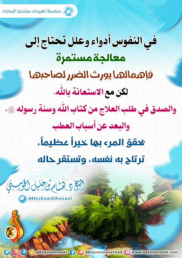 في النفوس أدواء وعلل تحتاج إلى معالجة مستمرة ... تاريخ الإضافة: الإثنين, 11/10/2021 - 17:04 التصنيفات الشيخ: د. هشام بن خليل الحوسني