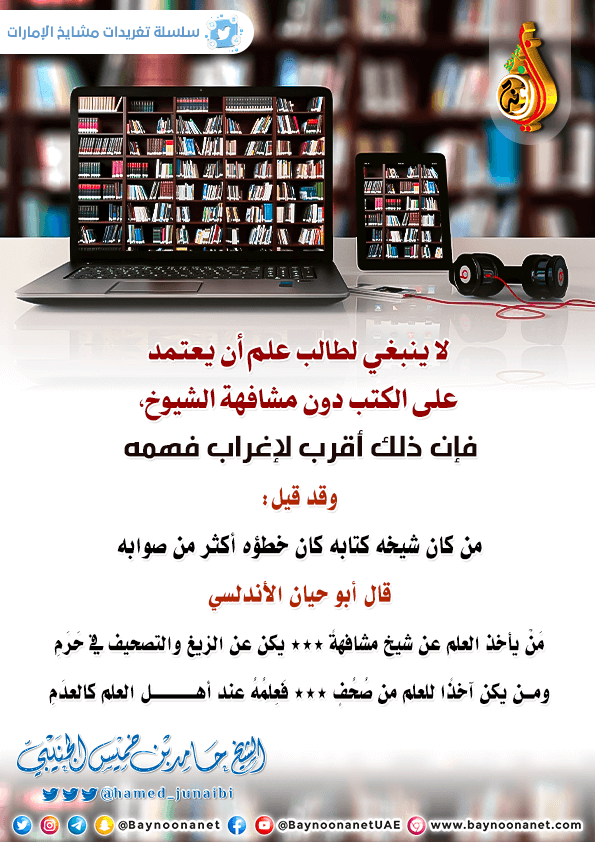 لا ينبغي لطالب العلم أن يعتمد على الكتب دون مشافهة الشيوخ تاريخ الإضافة: الثلاثاء, 19/10/2021 - 20:58 التصنيفات الشيخ: حامد بن خميس الجنيبي