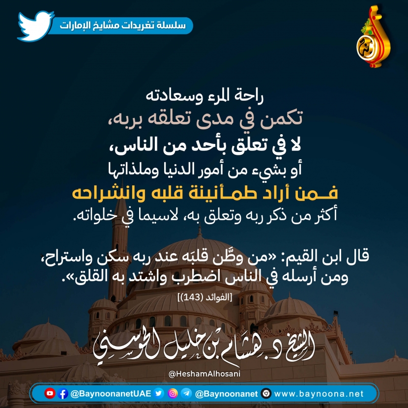 راحة المرء وسعادته تكمن في مدى تعلقه بربه ... تاريخ الإضافة: الثلاثاء, 15/02/2022 - 17:16 التصنيفات الشيخ: د. هشام بن خليل الحوسني