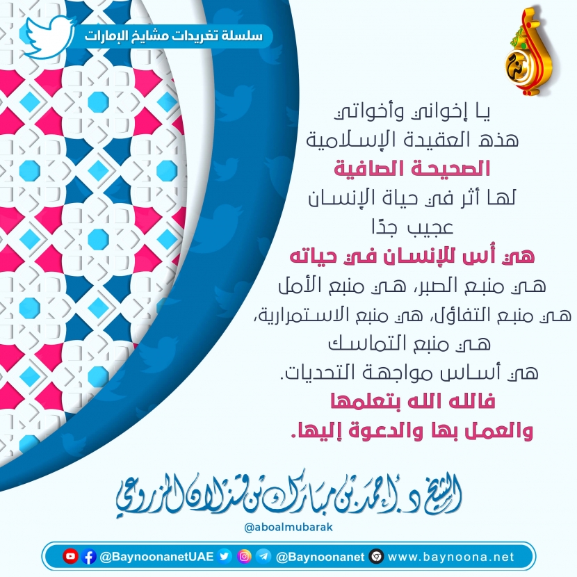 يا إخواني وأخواتي: هذه العقيدة الإسلامية الصحيحة الصافية لها أثر في حياة الإنسان ... تاريخ الإضافة: الأربعاء, 16/03/2022 - 20:22 التصنيفات الشيخ: د. أحمد بن مبارك المزروعي