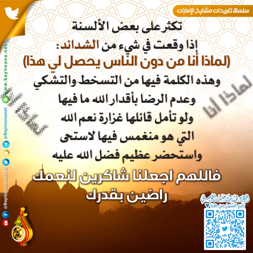 تكثر على بعض الألسنة إذا وقعت في شيء من الشدائد: ( لماذا أنا من دون الناس يحصل لي هذا ) ... تاريخ الإضافة: السبت, 16/07/2022 - 20:32 التصنيفات الشيخ: د. هشام بن خليل الحوسني