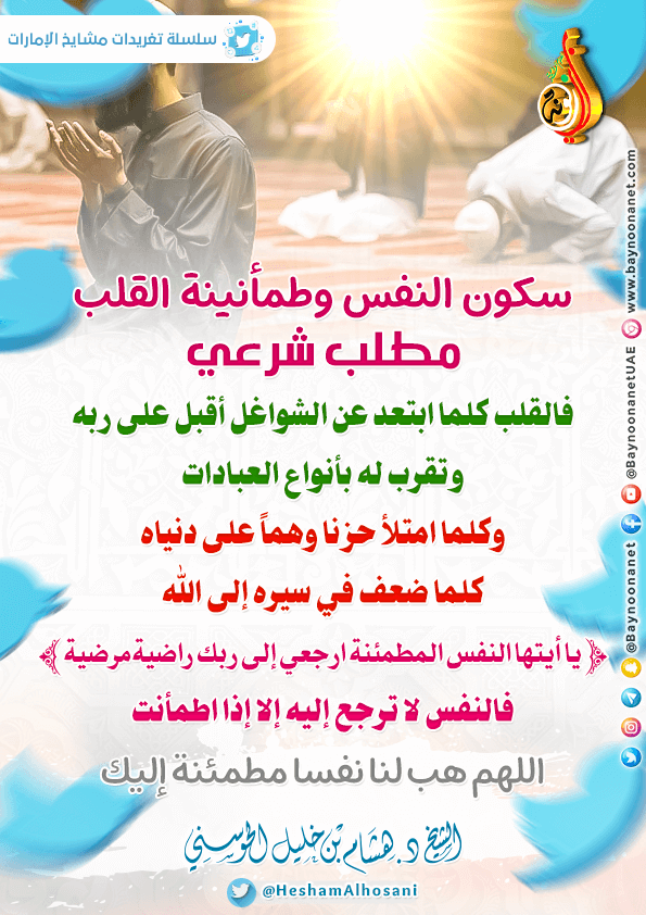 سكون النفس وطمأنينة القلب مطلب شرعي ... تاريخ الإضافة: الإثنين, 08/08/2022 - 21:32 التصنيفات الشيخ: د. هشام بن خليل الحوسني