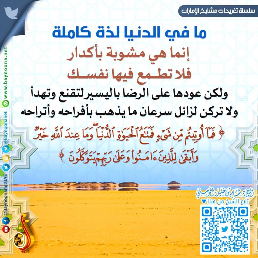 ما في الدنيا لذة كاملة تاريخ الإضافة: الجمعة, 12/08/2022 - 21:58 التصنيفات الشيخ: د. هشام بن خليل الحوسني