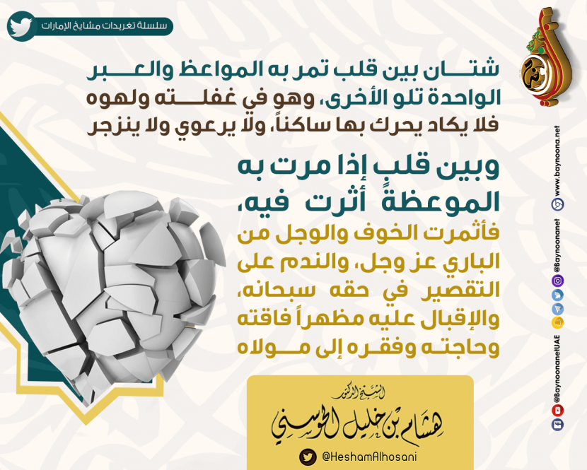 شتان بين قلب تمر به المواعظ والعبر... تاريخ الإضافة: الأربعاء, 20/09/2023 - 00:01 التصنيفات الشيخ: د. هشام بن خليل الحوسني